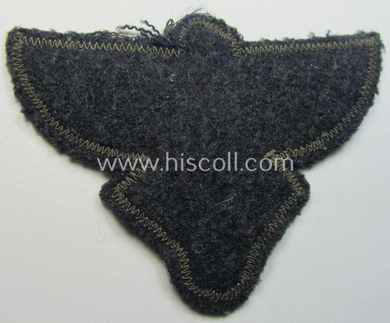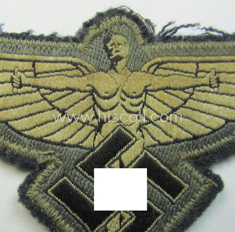This is a very attractive - and actually not that easily found! - example of a bluish-grey-coloured, so-called: N.S.F.K.- (or: 'National Socialistisches Flieger Korps') breast-eagle ('Armadler für Mannschaften u. Unteroffiziere des N.S.F.K.') being a nicely ('BeVo'-) woven- (and enlisted-mens'- ie. NCO-pattern) example depicting the 'Fliegender Mensch'-symbol that comes (pre)mounted on its piece of bluish-coloured wool and that comes in an overall very nice- (ie. just moderately used- ie. I deem once shirt- ie. tunic-attached-), condition. The breast-eagle - which is neatly woven in the so-called: 'BeVo'-like weave-technique - comes (off-factory) mounted on its bluish-coloured- and/or woolen based backing but misses an 'RzM'-etiket as more often (as can be seen on the pictures). The piece was just minimally used ie. presumably once tunic-(ie. shirt-) attached and does show some minimal signs of having been worn and used as such (as can be seen on the pictures). Simply an attractive EM- ie. NCO-pattern example that was specifically intended for usage on the bluish-coloured: 'N.S.F.K.-Dienstblusen' (ie. shirts or tunics)!