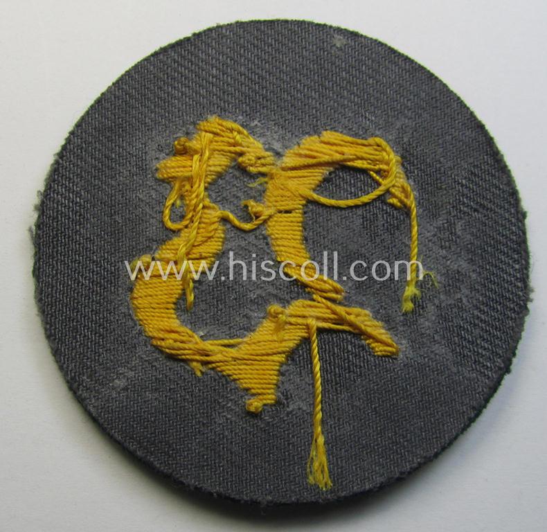 This is a truly attractive - and actually not that easily found! - example of a WH (Heeres) so-called: trade- and/or special-career arm-insignia (ie.: 'Laufbahn- o. Tätigkeitsabzeichen') as was specifically intended for an army: 'Zahlmeister-Anwärter o. Verwaltungs-Unteroffizier' (or: paymaster-candidate- ie. junior administration-NCO) and that comes in an overall nice- (I deem simply never worn- ie. 'virtually mint'-), condition. The neat patch is executed on a darker-green-coloured- and/or woolen-based background and shows a (detailed, Gothic-styled and/or neatly hand-embroidered-) 'V'-sign as executed in bright-yellow-coloured linnen. The patch is totally void of a makers'-designation (as more often) and is nicely 'backed' with greyish-black-coloured linnen as more often encountered. The patch shows some minimal staining simply caused by decades of storage only. Simply an attractive WH (Heeres) trade- ie. specialist career-badge and one of the more difficult to encounter specimen of the extensive series!