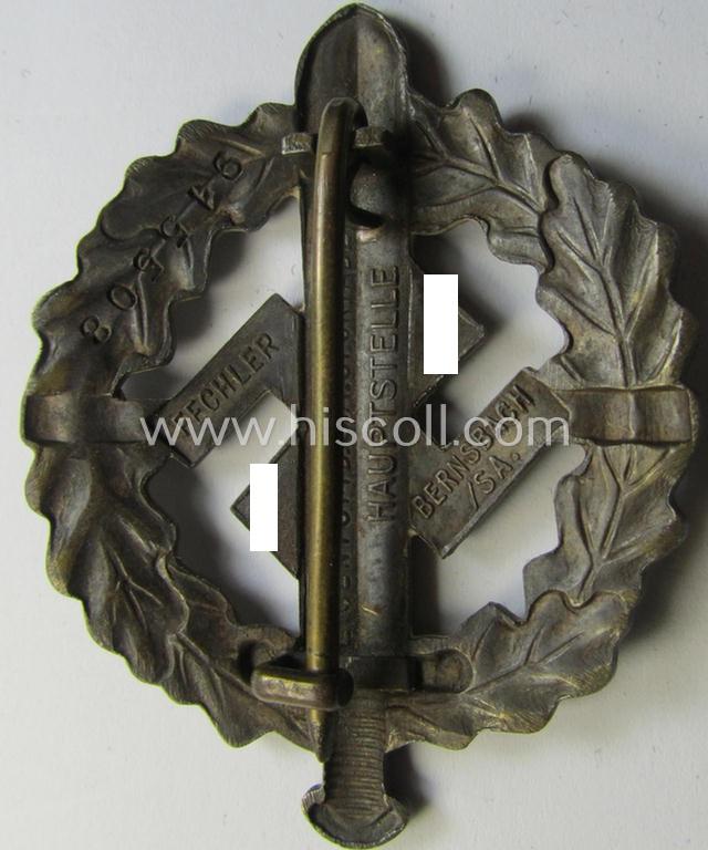 Neat, early- (ie. pre-) war-period example of an: 'SA-Sportabzeichen in Bronze' being a detailed and/or neatly maker- (ie. 'Fechler - Bernsbach i. Sa.'-) marked example that shows an impressed bearers'-number (ie. '915508')