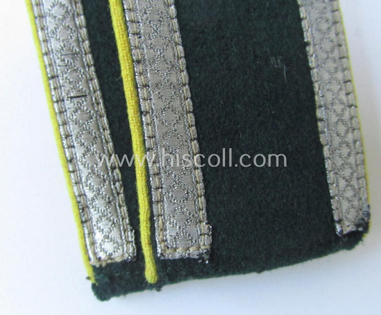 This is an attractive - and fully matching! - pair of WH (Heeres), (I deem) early-war-period (ie. 'M36'/M40-pattern, rounded-styled) NCO-type shoulderstraps as was piped in the neat bright-yellow- (ie. 'zitronengelber'-) coloured branchcolour as was spefcifically intended for - and most certainly worn by! - an: 'Unteroffizier der Heeres Nachrichten-Truppen' (or junior-sergeant who served within an army-signals unit ie. regiment) and tha comes in an overall very nice- (albeit moderately used ie. worn-), condition. The neat straps - which have the 'standard'-pattern, darker-green-coloured- and/or 'smooth-woolen'-based 'upperdecks' and which are of the 'regular-issued'-type - show the neat bright-yellow- (ie. 'zitronengelber'-) coloured- (and/or: woolen-type-) piping attached. The straps which measure approximately 11,2 cms. in length each, come mounted onto their functional tongues and come in a nice, ie. fully 'text-book'-condition, overall. I deem that they once had chain-stitched regimental numerals BUT these were period-removed (as per regulation): some remains are present but hardly visible. The shoulderstraps show the 'standard'-type, silverish-coloured NCO-braid attached denoting the NCOs-rank of: 'Unteroffizier' and show - as stated above - only moderate usage ie. wear (some regular age, dust and/or staining is clearly visible and/or present). The pair originates from a private-household in Germany and was carefully stored and kept as such for decades: the pair was never before in a collection. Simply a nice occasion to acquire a neat and most certainly desirable NCO-type, 'Heeres Nachrichten'-shoulderstrap-pair that was worn by an: 'Unteroffizier der Heeres Nachrichten-Truppen'!