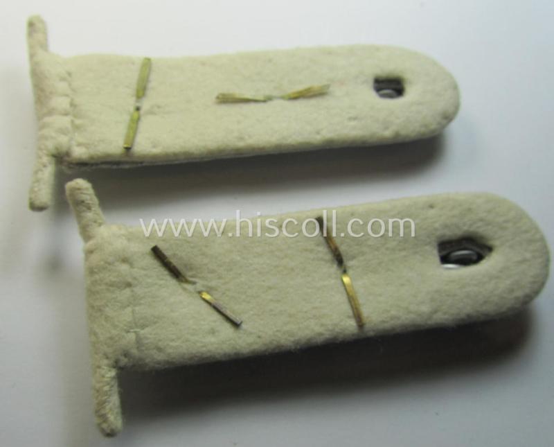 This is a truly very attractive - and/or fully matching! - WH (Heeres), officers'-type shoulderboard-pair (that comes mounted on its unsually seen: 'Auf der Steg'-mounting!) and that is piped in the neat white- (ie. 'weisser'-) coloured branchcolour as was specifically intended for usage by a: 'Hauptmann eines Infanterie-Regiments' (or: army-captain who served in an infantry regiment) and that comes in an overall very nice- (and I deem just minimally used ie. worn- and/or tunic-removed-), condition. The shoulderboards come mounted on their seldomly seen 'Auf der Steg'-set-up ie. mounting and where most likely used onto a white-coloured- (or: summer-type-) tunic. They are truly 'text-book'-examples of the 'Heeres'-type 'Infanterie'-shoulderboards and have the bright-silver- (ie. somewhat shiny-) 'upperdecks'. The boards show the white- (ie. 'weisser'-) coloured branchcolour (and are constructed from the smooth- ie. 'moleskin'-type wool). The boards show each two (larger-sized, golden-toned- and/or: 'Buntmetall'-based- albeit minimally tarnished-) pips period-attached, denoting the officers'-rank of: 'Hauptmann' or: captain. The boards measure approximately 10,5 cms. in length each and came with a (matching) pair of pebbled-styled, silver-toned shoulderboard-buttons. The pair was most certainly used and/or worn as such and does show some minimal age, wear and/or staining. Simply a very attractive - and comparatively scarcely encountered! - officers'-type, 'Infanterie'-related shoulderboard-pair that belonged to a: 'Hauptmann eines Infanterie-Regiments'!