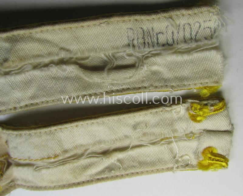 This is a truly very attractive - and/or fully 'textbook'! - example of a WH cuff-title (ie. 'Ärmelstreifen') entitled: 'Kreta' (being an example that bears a seldomly seen, printed 'RbN.'-numeral that reads: 'RBN.0/0250/...') and that comes in an issued-, clearly worn- and/or most certainly once tunic-attached, condition. The cuff-title comes in a minimally, period-shortened condition (ie. it measures approximately 39 cms.) and was as stated above issued and/or worn. Both ends show some normal fraying as is more often encountered (as can be seen on the pictures). The cuff-title just shows some minimal age ie. staining caused by moderate wear and/or decades of storage only (as can be seen on the pictures). It should be stated that these 'Kreta'-cuff-titles are not to be regarded as commemorative cuff-titles (such as the 'Afrikakorps' cuff-title) but were regarded as official awards that needed official recognition (and entries in both 'Soldbuch' and/or 'Wehrpass'). Simply a very attractive and naturally genuine, period-example that will be very hard to be upgraded and that is I deem accordingly priced!