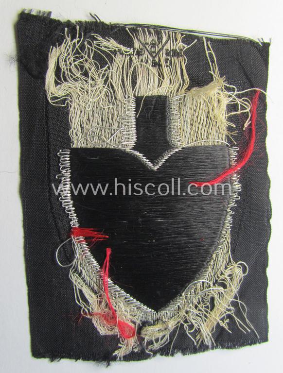 This is a very attractive - and actually very scarcely encountered! - officers'-version of a so-called: RAD (ie. 'Reichsarbeitsdienst') sleeve-badge (or: 'Dienststellen-Abzeichen') bearing the specialist-designation: 'M' (as was intended for a senior RAD-official with the not that often seen function of: 'Hauptmeldebeamter' (or: senior-communications-official) and that comes in an overall very nice- (ie. 'virtually mint' and/or never used- nor tunic-attached-), condition. These badges were worn on the upper-left sleeve of the mustard-coloured (officers'-type-) RAD-tunics and/or garments. The badge - which shows the red-coloured 'M'-character - is neatly executed in so-called 'flat-wire'-like-'BeVo'-weave technique. The piece was never folded nor trimmed as to be expected (but does show some minimal fraying on both top and bottom). The badge is neatly maker-marked and displays the interwoven so-called: 'Ges.Gesch.'-make as is more often found on RAD cloth badges- and/or insignia. This badge originates from a smaller collection of rarely seen RAD cloth-insignia I recently acquired for the web-site. It should be noted that all RAD officers'-type badges are comparatively scarcely encountered: those intended for specialised functions even more so!