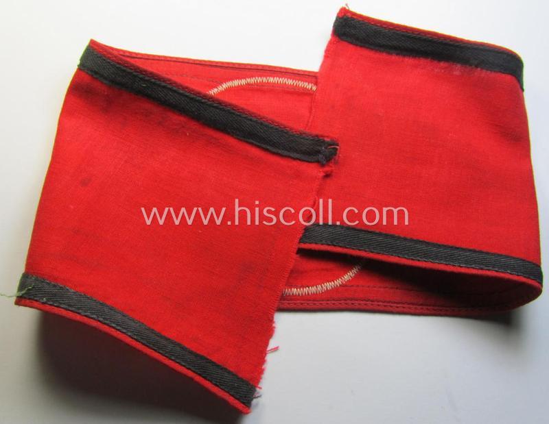 This is a very attractive - actually rarely encountered and I deem just moderately worn- ie. used! - example of an (I deem) 'pre-war'-period, so-called: 'Allgemeine-SS'-related armband (ie. 'Armbinde') being a (partly)printed specimen showing a separately-applied swastika (ie. roundel) attached and that comes in an overall very nice- (ie. I deem just moderately used- ie. worn-), condition. These linnen-based armbands were 'standard-issue' for usage by the various Allgemeine-SS members and/or officials (and were intended to be worn on the various black-coloured attire) and were worn on the left upper-arm. This example - that was 'loosened' and that is having a total size of 37,5 cms. and that is approximately 10,5 cms. wide as more often encountered - is neatly constructed from bright-red-coloured linnen and shows a neat (linnen-based- and typically interwoven!) 'roundel' that shows a black-coloured swastika in place, attached. This swastika-patch is neatly executed in so-called: BeVo-weave-pattern whereas both black-coloured borders are executed from typical rib-cord linnen as to be expected (as can be seen on the pictures). Of interest is, moreover, the fact that these borders were attached BEFORE the roundel was attached. This example is truly nicely made and does just show some minimal age ie. staining simply caused by decades of storage and/or moderate usage (as can be seen on the pictures). Simply a very attractive - and truly rarely found! - 'Allgemeine-SS'-related item that is with certainty accordingly priced!