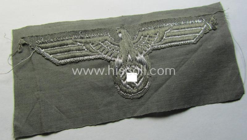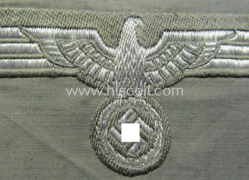 This is an attractive example of a neat - and I deem very early- ie. 'Reichswehr'-period! - WH (Heeres) officers'- (ie. eventually NCO-) type breasteagle (ie.'Brustadler für Offiziere des Heeres') being a 'virtually mint- ie. unissued' example as executed in attractive so-called: 'flat-wire'- (ie. 'BeVo'-) weave-pattern on a field-grey- (ie. bluish-green-) coloured- and/or linnen-based background and that comes in an overall very nice- (ie. 'virtually mint- ie. unissued'-), condition. This - actually scarely encountered! - breast-eagle is executed in the so-called: 'BeVo-flat-wire'-weave style and is executed in silverish-toned thread on a (typical) field-grey-coloured background (and having a field-grey-coloured and/or linnen-based 'backing' as to be expected). These eagles were presumably intended for officer- (ie. NCO-) usage and have truly stunning detail (as can be seen on the pictures) and simply cannot be upgraded: it comes 'as straightly cut-off the role' and was naturally never folded nor confectioned. Moreover, does it show some minimal glue-remains on its back simply caused by having glued into an album or scrapbook once (as can be noticed on the pictures). This example originates from a 'Musterbuch' (or: sample-book) that was period-compiled by the producing-company 'Offermann' as was based in the town of Ratingen. Simply a great opportunity to acquire a neat and very early- (ie. 'Reichswehr'-) period, WH (Heeres) officers'-/ie. NCO-type breasteagle as executed in 'BeVo-flat-wire'-weave-style!