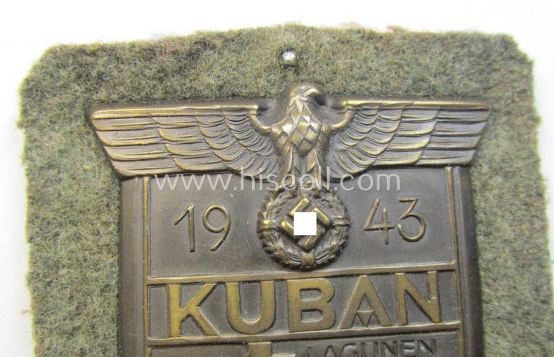 Attractive - just minimally used and actually scarcely encountered! - WH (Heeres ie. Waffen-SS) 'Kuban'-campaign-shield that comes mounted onto its original field-grey-coloured- and/or woolen-based 'backing'