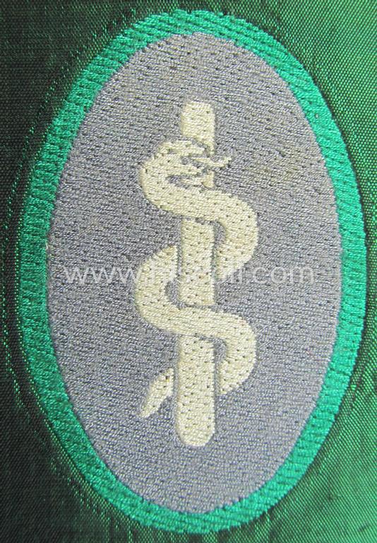 This is a truly attractive - and actually scarcely encountered! - example of a neatly 'BeVo'-woven so-called: 'Sicherheits- u. Hilfsdienst' (ie. 'SHD'-) armbadge (ie. 'Ärmelabzeichen') being a greyish-coloured example depicting an: 'Aesculapus'-symbol as was intended for a: 'Feldscher' (ie. medical SHD-staff-member) and that comes in an overall very nice- (simply never used- ie. 'virtually mint- ie. unissued'-), condition. The badge - which depicts a silver-white-coloured, 'Aesculapus'-symbol on a greyish- (and green-rimmed!) coloured background - was introduced in late 1941 and was one of a series of - at least - six different such SHD speciality- ie. trade-badges. These 'specialist' badges were worn on the left upper-arm. The piece comes - as stated above - in a simply never used- ie. 'virtually mint- ie. unissued' condition: it came as 'straightly cut-of the role'. The patch is just a tiny bit stained caused by storage-age only and does show some (minimal) damage in the background (the patch itself is of coure fully undamaged as can be noticed on the pictures. Simply an attractive - and actually scarcely encountered! - 'SHD'-arm-patch as was used by one of the lesser known TR-organisations!