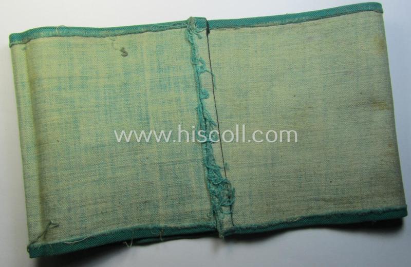This is an attractive - and with certainty rarely seen! - example of a (typical) darker-green-coloured, so-called: 'N.S.D.A.P.'- (ie. 'Luftschutz'-) related armband (ie. 'Armbinde') being of the 'entirely printed'-type showing the text: 'Luftschutz NSDAP' and that comes in an overall very nice- (ie. clearly issued- and/or most certainly worn ie. used-), condition. These linnen-based armbands were presumably intended for usage by the various 'N.S.D.A.P.'-members and/or officials that were tasked as 'Luftschutz'-staff during for example political gatherings and/or events and were worn on the left upper-arm. This example - having a total size of approximately 42 cms. and that 12 cms. wide as more often - is constructed from (typical) darker-green-coloured linnen and shows the text as mentioned above. This example was 'off-factory' stitched-together and shows a vaguely (but most certainly!) present ink-stamp (as can be seen on the pictures). Simply a very attractive - and with certainty rarely seen! - 'N.S.D.A.P.'- ie. 'Luftschutz'-related armband that is priced according to its comparative rarity and/or desirability!
