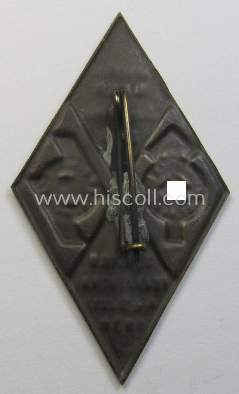 This is a very attractive - and with certainty quite scarcely found! - so-called: HJ- ('Hitlerjugend') ie. DJ- ('Deutsches Jungvolk') related 'tinnie' (ie. 'Tagungs- o. Veranstaltungsabzeichen') showing two youth-related sports'-badges (ie. 'Leisungsrunen') and text that reads: 'Sportfest Bann Jungbann 343 - Stadion Frankenthal - 4. u. 5. Juli 1938' and that comes in an overall very nice- (albeit issued- ie. I deem just moderately worn-), condition. The 'Raute'-shaped piece is executed from golden-bronze toned- (ie. I deem copper-toned- ie. 'Eisenblech'-based) metal and is (as more often) totally void of a makers'designaton. The piece is as mentioned above executed in typical, golden-bronze-coloured metal: it shows some normal wear and/or moderate age but has (not recently) been cleaned nor polished (it is still a bit dirty but has maintained a nice, minimally darkened- ie. tarnished, age-patina and holds most of its period-apllied finish). The badge shows two youth-related sports'-badges (ie. 'Leisungsrunen') and text that reads: 'Sportfest Bann Jungbann 343 - Stadion Frankenthal - 4. u. 5. Juli 1938' (as can be seen on the pictures). The medium-sized piece (sized: 5,4 x 3,6 cms.) comes naturally mounted onto its functional pin- ie. pin/catch set-up and shows some minimal age ie. staining (as can be seen on the pictures). It should be noted that all youth-related tinnies that were intended to commemorate an event at regional- (ie. 'towns'-) level (such as the piece on offer here) saw much more limited usage and can easily be graded 'scarce'. Simply a nice occasion to acquire an attractive - and truly unusally found! - HJ- ('Hitlerjugend') ie. DJ- ('Deutsches Jungvolk') related, so-called: 'Tagungs- o. Veranstaltungsabzeichen' for an interesting price!