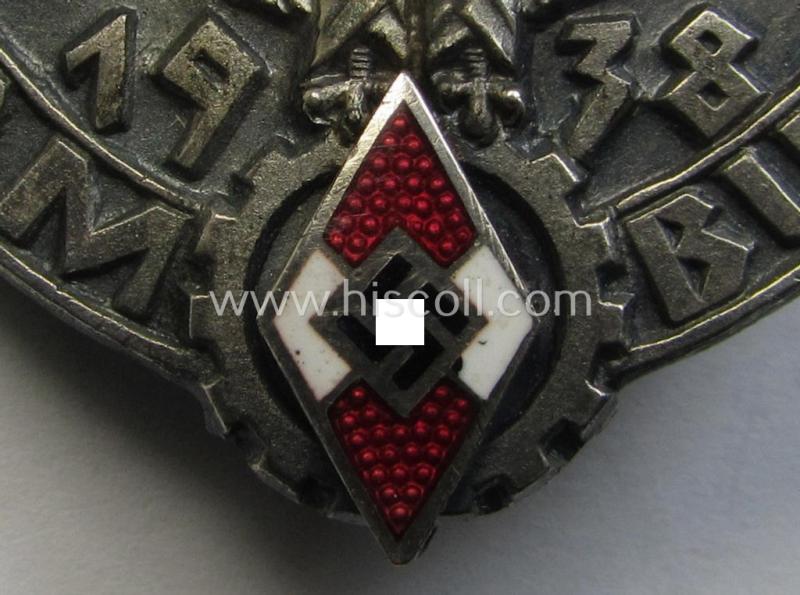 Stunning - and luxuriously styled! - HJ- ie. BDM (ie. 'Hitlerjugend' or: 'Bund Deutscher Mädel') related day-badge (ie. 'tinnie') being a golden-toned- and/or 'Feinzink'-based example as issued to commemorate the: 'Reichskampf Hamburg 1938'