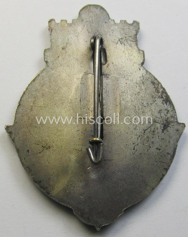 This is a very attractive - and actually very rarely encountered and truly luxuriously styled! - HJ- ie. BDM (ie. 'Hitlerjugend' or: 'Bund Deutscher Mädel') related, commemorative day-badge (ie. 'tinnie' ie. 'Veranstaltungsabzeichen') being a bright-silverish-toned- and light-weight, (I deem) zinc- ie. 'Feinzink'-based example as was issued to commemorate a specific (national!) youth-rally ie. gathering named the: 'Reichsberufs-Wettkampf der Deutschen Jugend' that was held in the year 1938 and that is entitled: 'Reichskampf Hamburg 1938' and that comes in an overall very nice- (albeit surely issued ie. moderately worn-), condition. The very detailed and/or pronounced badge truly shows extraordinary detail and was almost certainly never cleaned nor polished. The - as more often non-maker-marked - piece shows a detailed illustration of the Hamburg-based tower (ie. 'Hamburger Tor') and eagle-device (holding a so-called, enamelled: miniature 'HJ-Raute') with above that the years'-designation (1938) and (Gothic-styled) text as mentioned above. The badge comes naturally mounted onto its (functional and totally unaltered) pin-/catch set-up. Simply a very attractive - and with certainty rarely seen! - youth-related 'tinnie' ie. 'Veranstaltungsabzeichen' that is truly not that often offered for sale!