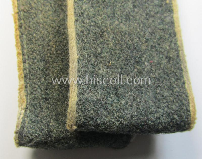 The attractive - very roughly-executed but nevertheless truly unusually seen! - WH (Heeres) shoulderstraps do show the desirable white- (ie. 'weisser'-) coloured and (very unusual and 'thicker-styled'!) linnen-based, 'cord-like'-type piping attached and measure approximately 10 cms. in length each and are clearly of the so-called: 'last-ditch'- (ie. M44/M45-) pattern. The shoulderstraps are constructed from the (field-grey-toned- and/or quite roughly executed ie. Italian-style) later-war-type wool (aka 'drap Orti') (as can be seen on pictures). The straps come naturally mounted onto their simplified tongues and do show clear usage and/or moderate wear ie. age (as can be seen on the pictures). The pair was clearly used and/or worn as such. It should be noted that these matching pairs of white-piped- (thus 'Infanterie'-related and/or later-war period- ie. 'simplified'- ie. M44/M45-pattern-) enlisted-mens'-type shoulderstraps are very desirable and can easily be graded 'very scarce' even more so when they come in this moderately used- and/or truly worn condition!