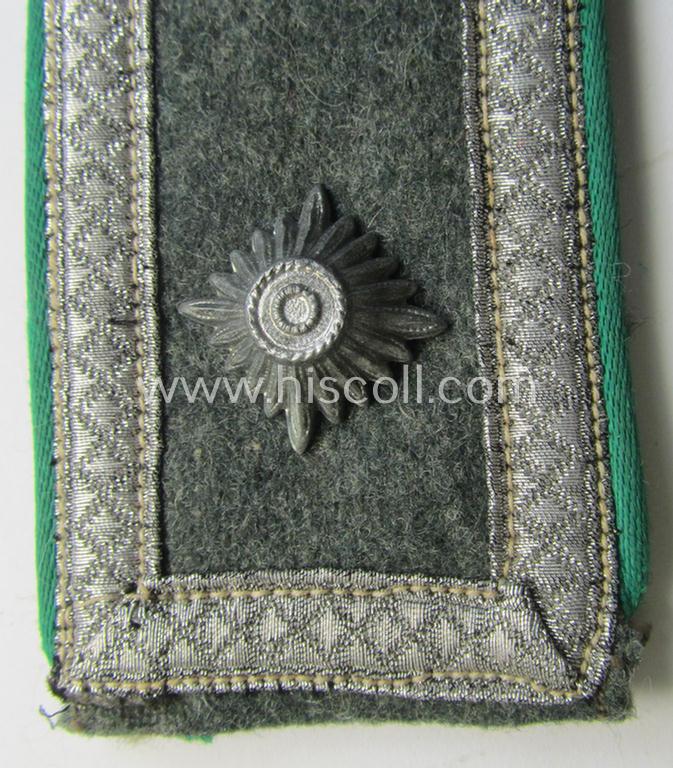 This is a neat - albeit regrettably single but nevertheless scarcely encountered! - WH (Heeres) early-war-period, so-called: 'M40-/M43'-pattern (I deem) 'summer-type' NCO-shoulderstrap (being of the model as was specifically intended for the 'Gebirgsjäger-Windjacke') as was piped in the darker-green- (ie. 'grüner'-) coloured branchcolour as was intended for usage by a: 'Feldwebel eines Gebirgsjäger-Regiments' (or: NCO and/or sergeant who served within an army mountain-troops regiment) and that comes in an overall very nice- (albeit moderately used ie. worn- and/or 'clearly cut-of a tunic'-), condition. The longer-sized shoulderstrap - which is approximately 13,5 cms. sized in length as to be expected - has the 'standard-type'- and/or field-grey-coloured, woolen-based 'upperdeck' (as can be seen on the pictures). The strap shows the desirable 'silk-like'-type piping and has the standard-issued, silver-toned NCO-braid an a single (zinc-based) pip attached denoting the NCOs-rank of: 'Feldwebel' ie. sergeant (as can be seen on the pictures). The strap - which comes without a tongue - shows as stated above some moderate usage and/or wear (some minor staining and/or dust is visible and/or present). It should be noted that all 'Gebirgsjäger'-raelated, WH (Heeres) shoulderstraps can easily be regarded 'fairly scarce' even more so when they are specifically produced for usage onto the specific 'Gebirgsjäger'-type, protective '3/4-model' jacket ie. rain-coat (or: 'Gebirgsjäger-Windjacke'). This strap originates from an older 'Gebirgjäger'-related shoulderstrap ie. board-collection that I recently acquired for the web-site. Simply an attractive and/or: early- (ie mid-) war-period, 'Heeres'-related NCO-type 'Windjacke'-shoulderstrap that was intended for usage by a: 'Feldwebel eines Gebirgsjäger-Regiments'!