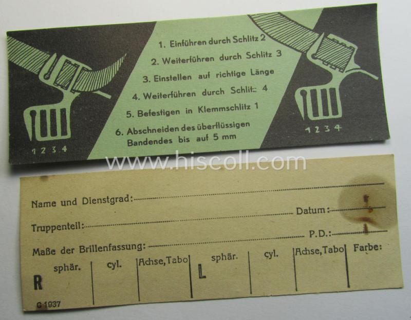 The pair of specific gas-mask-glasses (ie. 'Maskenbrille') was with certainty used as such and comes in a clearly worn- ie. moderately used condition: the pair - as well as the greyish-blue-coloured container showing the text: 'Masken-Brille' on its top - shows some regular usage-marks (as can be seen on the pictures). It came complete with its metal-rimmed pair of glasses that come mounted on their period-attached cords (as well as an unused spare-set of cords) and has its period prescription-lenses installed. Both paper-based 'inlays' are naturally also present (but are not filled-in). Simply an attractive and/or complete example of a WWII-period 'Maskenbrille': great to add to any WH-equipment set-up!