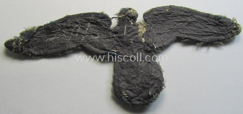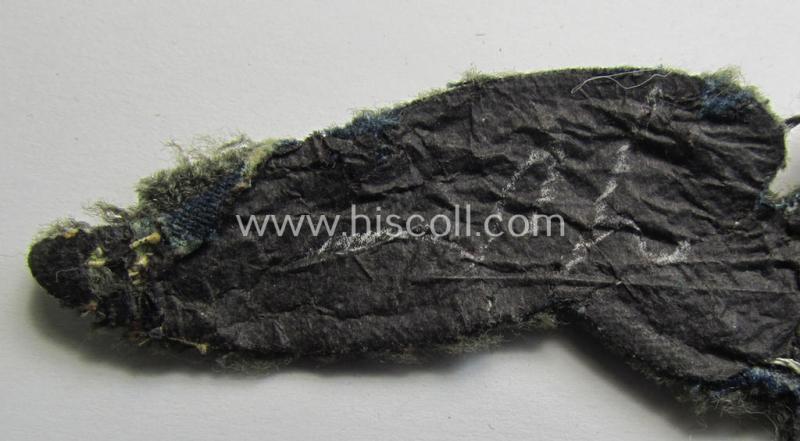 This is a truly very attractive - and actually exceedingly rarely encountered! - example of a neatly hand-embroidered, officers'-type visor-cap-eagle (ie. 'Schirmmützenadler für Beambten u. Mitglieder des Diplomatisches Korps o. Staatsbeamte') that comes embroidered onto a greenish-tan-coloured background as was specifically intended for usage by the various diplomats and/or foreign-office staff-members and that comes in an overall nice- (ie. moderately used- and/or carefully visor-cap-removed-), condition. The attractive eagle - having a 'wingspan' of approximately 13,2 cms. - is very nicely hand-embroidered using various tones of silver-toned 'braid'-based material onto a greenish-tan-coloured (and/or woolen-based) background: moreover, does it show some highlighted areas as executed in somewhat shiny, silver-toned- and/or braid-based thread (as can be seen on the pictures). The eagle is - as stated above - clearly used- and was once visor-cap-attached: it is, however, void of any real damage but does show some staining ie. corroded areas. It shows a bluish-black-coloured and (thin-shaped) paper-based 'backing' as is more often observed and does show an inked (but undecypherable) inventory-numeral (as can be seen on the pictures). Simply a neat occasion to acquire a very attractive - and exceedingly rarely found! - example of the 'Extra Klasse'-quality, TR-period visor-cap-eagle that can naturally easily be re-attached to any 'Diplomatisches Korps o. Staatsbeamte Schirmmütze' or to be simply kept in any eagles'-collection: just the first such rare example I ever had on offer!