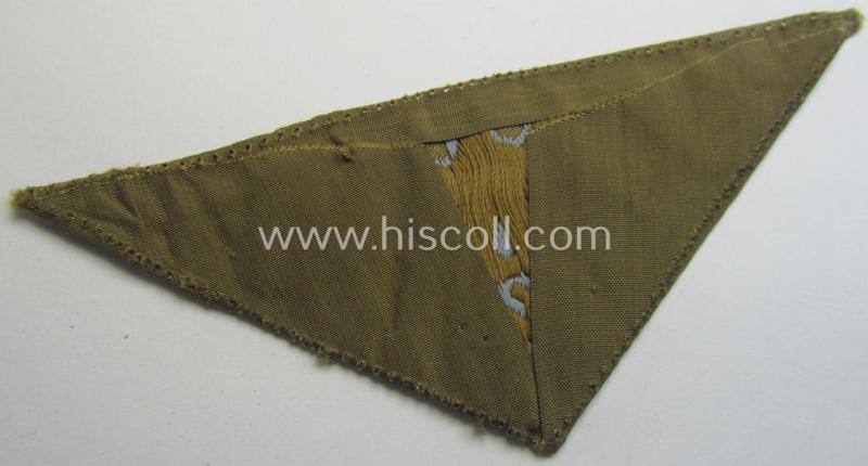This attractive - and I deem somewhat later-war-period! - example is neatly greyish- ie. light-blue-coloured (as to be expected) and was executed on a tropical-pattern, brownish- (ie. typical tan-) coloured and/or: linnen-based background as to be expected. The piece comes - as stated above - in a nice albeit clearly pre-folded- (but non-trimmed!) condition (it was carefully confectioned- and/or folded into a trapzoid-shaped format!) and was (I deem) carefully tunic-removed as can be seen on the pictures). The piece is just a tiny bit stained (ie. faded) caused by years of storage and/or moderate wear but has maintained very nice detail overall. These original 'BeVo'-woven examples are getting nowadays almost impossible to find something that merits its I deem justified asking-price. The piece was with certainty folded- and/or tunic-removed) and can as such perfectly serve to restore any tropical-tunic (or even shirt). These 'tropical-issue-' (ie. DAK- or 'Deutsches Afrika Korps'-related-) breasteagles can easily be graded 'scarce' and are nowadays not that often offered for sale!