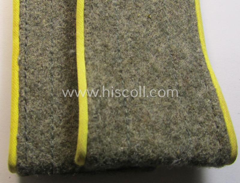 This is an attractive - and fully matching! - pair of later-war-period, WH (Heeres) so-called: 'M44'-style-, 'simplified', enlisted-mens'-type shoulderstraps as was piped in the neat bright-yellow- (ie. 'zitronengelber'-) coloured branchcolour as was intended for - and used by! - a: 'Soldat der Nachrichten-Truppen' (or: simple soldier who served within a later-war-period, army signals'-regiment) and that comes in an overall very nice- (ie. hardly used- ie. 'virtually mint'-), condition. The straps - which are approximately 11 cms. sized in length each - have the 'standard-pattern'- and/or typical, field-grey-coloured and/or woolen-based 'upperdecks' and/or tongues (whick latter aree executed in so-called: Italian wool aka 'drap Orti') and do show the bright-yellow- (ie. 'zitronengelber'-) coloured and/or: 'silk-like'-type branchcolour (ie. piping) attached. The straps are constructed following the typical '1944 cloth-minimising production-manner', using different shades of wool and/or material (as can be seen on the pictures). The straps show some minimal staining and/or age caused by decades of storage. It should be noted that all 'M44'-style, EM-pattern shoulderstraps are actually quite hard to encounter and can easily be graded 'scarce'. Simply a nice occasion to acquire an attractive - and fully 'text-book'! - M44-styled, enlisted-mens'-type shoulderstrap-pair as was intended for usage by a: 'Soldat der Nachrichten-Truppen': great to complete any later-war M44- (ie. even M43-) model 'Heeres'-tunic!