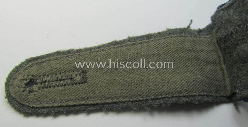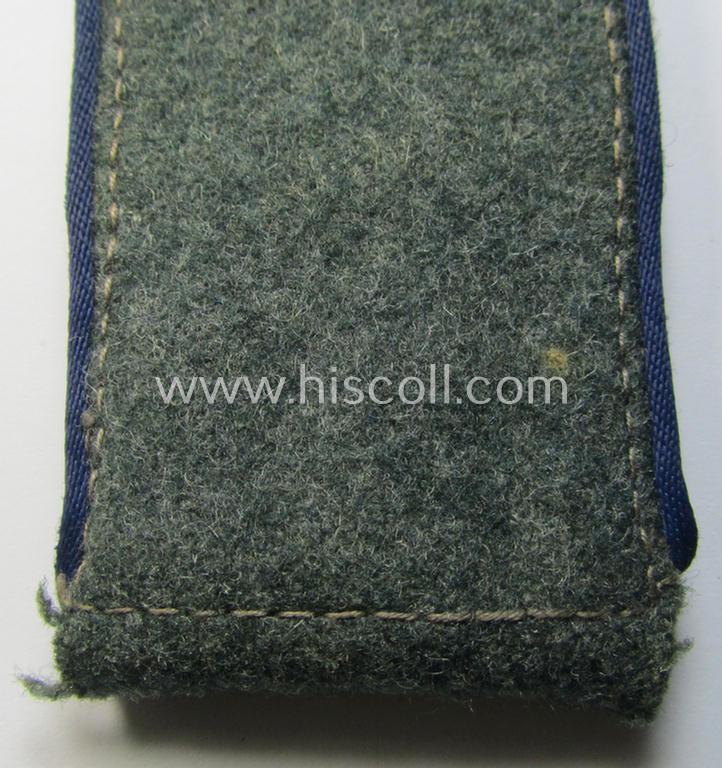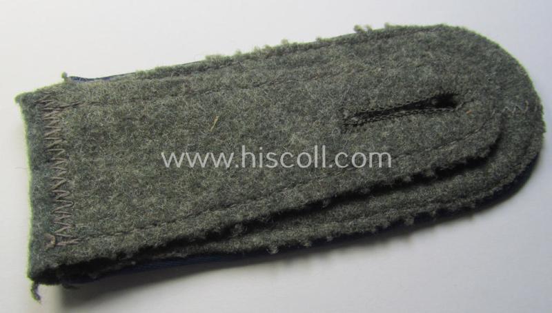 The attractive - albeit regrettably single but nevertheless scarcely found! - shoulderstrap is (I deem) of the early- (ie. mid-war-) period- (ie. 'M41- o. M43'-) pattern and does show some obvious age, wear and/or minimal staining. The strap has the field-grey-coloured- and/or woolen-based 'upperdeck' and does show the neat darker-blue- (ie. 'blauer'-) coloured branchcolour and desirable 'silk-like'-type piping attached (as can be seen on the pictures). The shoulderstrap comes mounted onto its functional tongue attached and was with certainty a piece that was used onto a 'front-type'-tunic. The strap - which measures approximately 11 cms. in length - was used by a: 'Soldat' (ie. simple soldier or medical orderly) who was attached to a specific: 'Sanitäts-Abteilung' (being a specific army medical-unit). Simply, a neat early- (ie. mid-) war-period, EM-type shoulderstrap as was intended for a: 'Soldat eines Sanitäts-Abteilungs o. Regiments' and that is I deem with certainty accordingly priced!