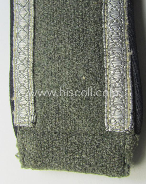 The attractive - albeit regrettably single but nevertheless scarcely found! - shoulderstrap is (I deem) of the early- (ie. mid-war-) period- (ie. 'M41- o. M43'-) pattern and does show some obvious age, wear and/or minimal staining. The strap has the field-grey-coloured- and/or woolen-based 'upperdeck' and does show the neat black- (ie. 'schwarzer'-) coloured branchcolour and desirable 'silk-like'-type piping attached (as can be seen on the pictures). The shoulderstrap comes mounted onto its functional tongue attached and was with certainty a piece that was used onto a 'front-type'-tunic. The strap - which measures approximately 11 cms. in length and that shows the 'standard-issue'-pattern, silver-toned NCO-braid attached - was used by an: 'Unteroffizier' (ie. junior-sergeant) who was attached to a specific: 'Pioniere-Abteilung o. Regiment' (being a specific army engineers-unit). Simply, a neat early- (ie. mid-) war-period, NCO-type shoulderstrap as was intended for an: 'Unteroffzier eines Pionier-Abteilungs o. Regiments' and that is I deem with certainty accordingly priced!