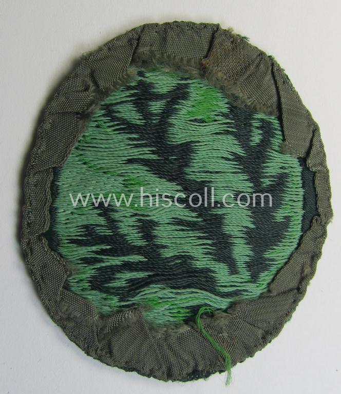 This is a neat - and truly used and/or worn! - example of a WH (Heeres) enlisted-mens'- (ie. NCO-) type, so-called: 'Jäger'-armpatch being a (typical) 'BeVo'-woven example as was executed on field-grey-coloured linnen as was intended for usage by the: 'Jäger-Truppen' and that comes in an overall very nice- (ie. truly worn and/or carefully tunic-removed-), condition. These attractive 'Jäger'-armpatches (as was intended for usage by the: 'Jäger-Truppen'- or: rifle-troops throughout the war) are showing three oakleaves on a darker-green-coloured background and were worn on the right upper-sleeve by the troops that were attached to the various 'Jäger'- (ie. rifle-) regiments (being some sort of mid-war-period, mountain-troop-related, infantry-units). Simply a nice occasion to acquire a neat (and of course genuine!) Heeres-'Jäger'-armpatch for an interesting price!