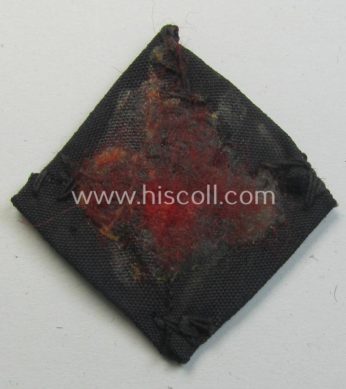 This is an attractive - and nowadays actually scarcely encountered! - WH (Heeres ie. 'Panzer') 'standard-issue'-pattern side-cap-cocarde (ie. 'Kokarde für Panzer-Schiffchen') being an example as executed in so-called: 'BeVo'-weave pattern and that comes in an overall nice- (ie. truly used- and/or carefully side-cap-removed-), condition. It should be noted that these side-cap- (ie. 'Schiffchen'-) insignia-pieces are quite difficult to encounter (and come hardly ever for sale). The piece - which is executed in the so-called: 'BeVo'-weave pattern and is executed in black-coloured linnen onto a black-coloured- and/or also linnen-based background: it was carefully confectioned and/or pre-folded and shows the signs of having been once cap-attached (as can be seen on the pictures). The piece shows some minimal age and/or staining but can, nevertheless, excellently be used to complete or restore any black-coloured side-cap (ie. 'Panzer-Schiffchen'). Simply an attractive 'Heeres Panzer'-related side-cap insignia-piece that is actually hard to encounter and that is I deem accordingly priced!