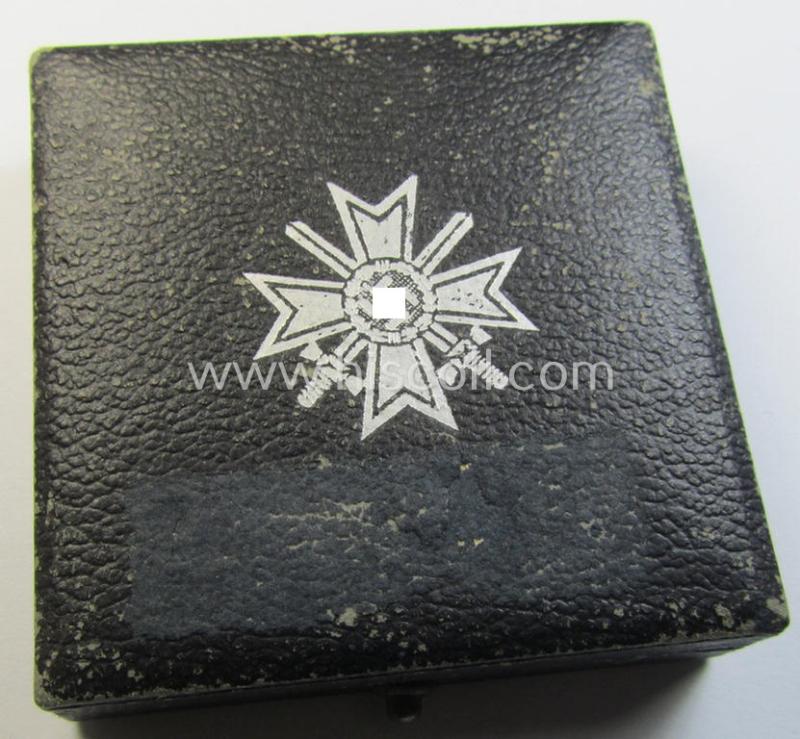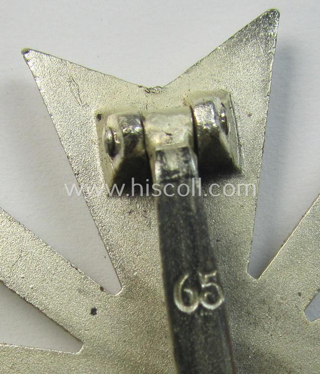 The attractive award is a detailed and clearly maker- (ie. '65'-) marked so-called: 'Buntmetall'- (ie. 'Tombak-') based specimen that was just minimally used and/or worn: it came still stored in its original (and truly fairly luxuriously-styled!) black-coloured etui as produced, issued and/or stored for decades. The attractive - and I deem typical early-war-period - specimen is executed in somewhat tarnished, silver-coloured- (and/or: 'Buntmetall'-based!) metal and comes in an overall very nice- (albeit just minimally worn- and/or used-), condition. The naturally non-magnetic- and/or non-vaulted cross shows a somewhat tarnished age-patina but has not recently been cleaned or polished: it still retains almost all of its 'frosted' silverish-coloured finish (and of-factory polishe highlighted areas) as can be seen on the pictures. The cross comes naturally mounted onto its functional (flute-shaped) pin- and/or: period catch (ie. catch-set-up) which are both present and unaltered (as can be seen on the pictures). The piece - which shows a clearly present makers'-designation on the back of the pin (as more often encountered by pieces produced by this maker) - comes as found and/or stored for decades. The etui comes in an equally nicely preserved condition: it is fully functional (and shows the printed, detailed and/or silverish-grey-coloured 'KvK'-symbol ie. silhouette on its top). The etui has a fully preserved, black-coloured- (ie. velvet-based-) interior-section but shows some stains on top and back (I deem) caused by a piece of cellotape (as can be seen on the pictures). Simply a great occasion to acquire a very attractive and fully complete and neatly maker-marked: 'Kriegsverdienstkreuz 1. Klasse mit Schwerter'-set for a justified price!