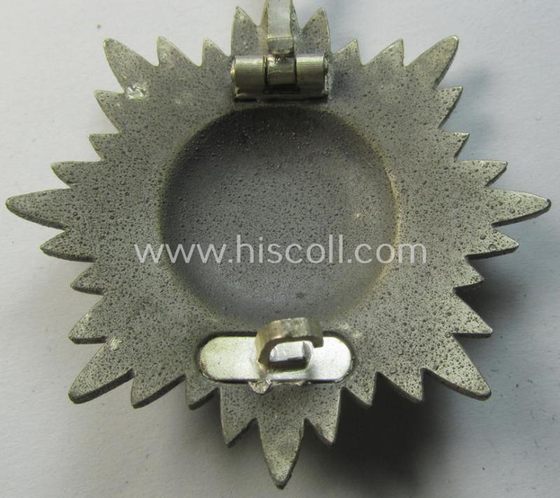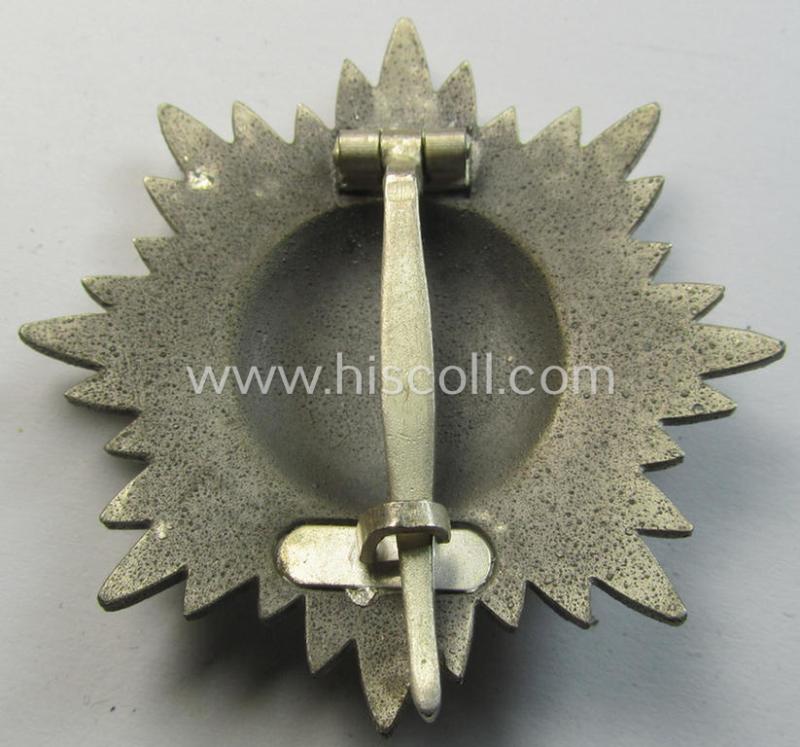 This is an attractive - and I deem just moderately used and actually fairly scarcely encountered! - WH-related, so-called: 'Verdienstauszeichnung o. Steckkreuz für Angehörige der Ostvölker, 1. Klasse in Silber ohne Schwertern' (or: silver-class 'Ostvölker' merit-medal ie. breast-star for merit on the Eastern Front being of the first-class-pattern without swords) being a clearly maker- (ie. '100'-) marked- and/or: silvered 'Feinzink'-based example that comes as issued and/or recently found. The neat award comes in an overall very nice- (I deem only minimally used ie. worn-) condition and retains most of its (fairly glossy) silver-toned finish and still retains great pronounced detail (it is just a tiny bit tarnished- ie. dirty as to be expected but was never cleaned nor polished: it comes naturally mounted onto its functional (and unaltered- somewhat longer-sized) pin- and/or typical pin-catch set-up as can be seen on the pictures). The piece shows a clearly present makers-designation '100' stamped into the back of the pin denoting that this piece was produced by the company: 'R. Wächtler & Lange' as was based in the town of Mittwaida in Sachsen. Simply a attractive - and desirable! - WH-related, so-called: 'Verdienstauszeichnung o. Steckkreuz für Angehörige der Ostvölker, 1. Klasse in Silber ohne Schwertern' that is accordingly priced!