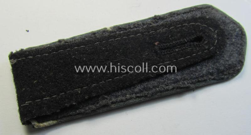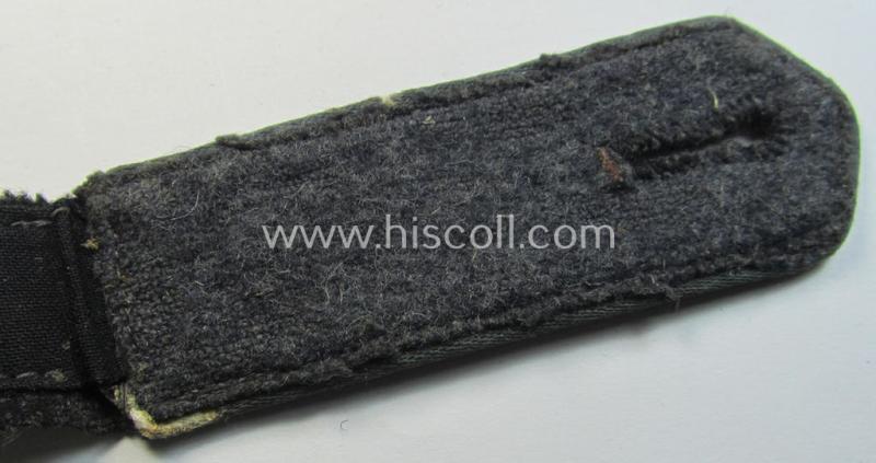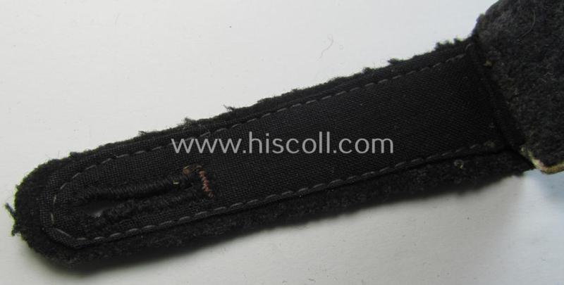 This is an attractive - albeit regrettably single and just moderately used- and/or worn! - WH (Luftwaffe- ie. Hitlerjugend-) related- and unusally 'cyphered', so-called: 'Flakhelfer'-shoulderstrap as piped in the (typical) bright-blue- (ie. 'kornblumenblauer'-) coloured branchcolour as was intended for usage by a: 'Flakhelfer' (ie. later-war-period, youthfull anti-aircraft staff-member) and that comes in an overall nice- (ie. just moderately used- and/or worn-), condition. The strap measures approximately 10 cms. in length (as more often) and has the black-coloured- and typical smooth-woolen-based 'upperdeck' (and has the 'silk-like'-type- and/or blue-coloured piping attached). The strap just shows some moderate wear and comes in an overall very nice- and/or fully undamaged, condition. The strap - that shows some moderate age and wear - shows the 'Luftwaffe'-type, bluish-grey-coloured- and/or woolen-based 'backing' and came mounted onto its (smaller-shaped) tongue (as can be seen on the pictures). The strap came from a German private-household and was never before in collectors'-hands. Simply an attractive, later-war period- and youth-related 'Flakhelfer'-shoulderstrap that is actually not that often offered for sale: too bad that it is only a single specimen!