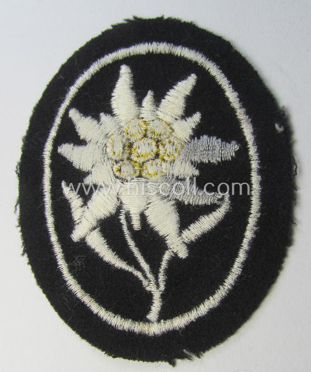 Waffen-SS-pattern, black-coloured sleeve-insignia (ie. 'Ärmelabzeichen') depicting an: 'Edelweiss'-flower, as used by the various 'Gebirgsjäger'- (ie. mountain-troops-) related divisional-staff