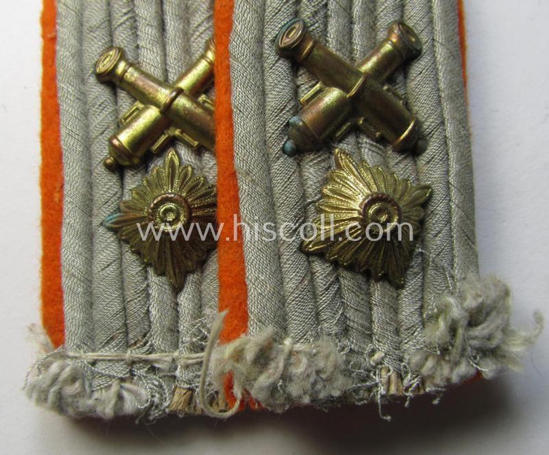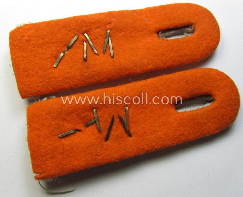 Superb - and fully matching! - pair of WH (Heeres) 'cyphered' officers'-type shoulderboards as piped in the bright-orange (ie. 'orangeroter'-)coloured branchcolour as intended for an: 'Oberleutnant u. Waffenoffizier' (or: weapon-equipment officer)