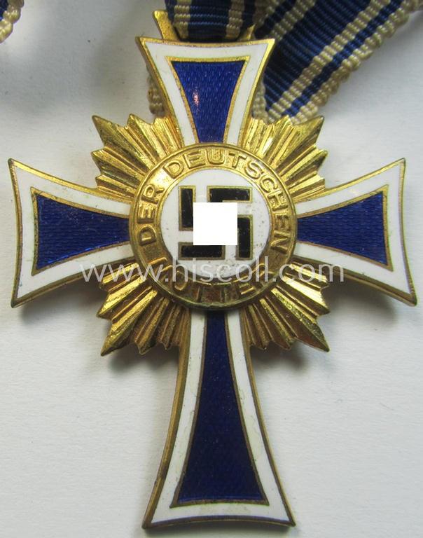 Attractive, 'Ehrenkreuz der deutschen Mutter - erste Stufe' (or: golden-class mothers'-cross) being a hardly used example that comes mounted onto its accompanying, long-sized ribbon as issued and/or recently found