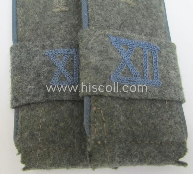 The very attractive - fully 'text-book' and fully matching! - pair of typical 'standard-issued'- (ie. 'non-privately-purchased'!) pattern, WH (Heeres) enlisted-mens'-type shoulderstraps is piped in the light-blue- (ie. 'kornblumenblauer'-) coloured branchcolour and measures approximately 11,2 cms. in length each. The straps have the light-blue- (ie. 'kornblumenblauer'-) coloured - and/or: desirable, 'silk-like'-type piping attached as is more often encountered with these early- (ie. mid-war-) period shoulderstrap-pairs and was as such intended for usage by transport-soldier (presumably a driver) who served within the: 'Nachschub-Abteilungs XII' (something that can naturally easily be deducted from the attached 'Überschube'-pair). The shoulderstraps - which originate from a larger cloth- ie. shoulderstrap-collection I recenly acquired for the web-site - are typical 'standard-issued'-examples that have the field-grey-coloured- and/or woolen-based 'upperdecks': they were - I deem - just minimally used ie. worn and do show some truly minimal wear, age and/or staining (as can be seen on the pictures). The straps come naturally mounted onto their functional tongues and came with a (also matching) pair of neat (field-grey-coloured- and/or woolen-based) so-called: shoulderstrap-slip-ons (ie. 'Schulterstück-Überschuben') attached bearing both the (Roman-styled) unit-designation: 'XII' (as executed in equally light-blue-coloured, so-called: 'Kurbelstickerei' done in wool as can be seen on the pictures). Both the shoulderstraps and/or: 'Überschuben' come in an overall very nice and/or fully undamaged condition (as can be seen on the pictures). These desirable 'M41- o. 43'-pattern, army-infantry-related EM-type shoulderstraps as piped in the 'kornblumenblauer'-coloured branchcolour can nowadays easily be graded 'fairly scarce'. Simply a very attractive - and fully matching! - Heeres EM-type shoulderstrap-pair that belonged to a: 'Soldat des Nachschub-Abteilungs XII' and that is I deem priced according to its scarcity and/or desirability!