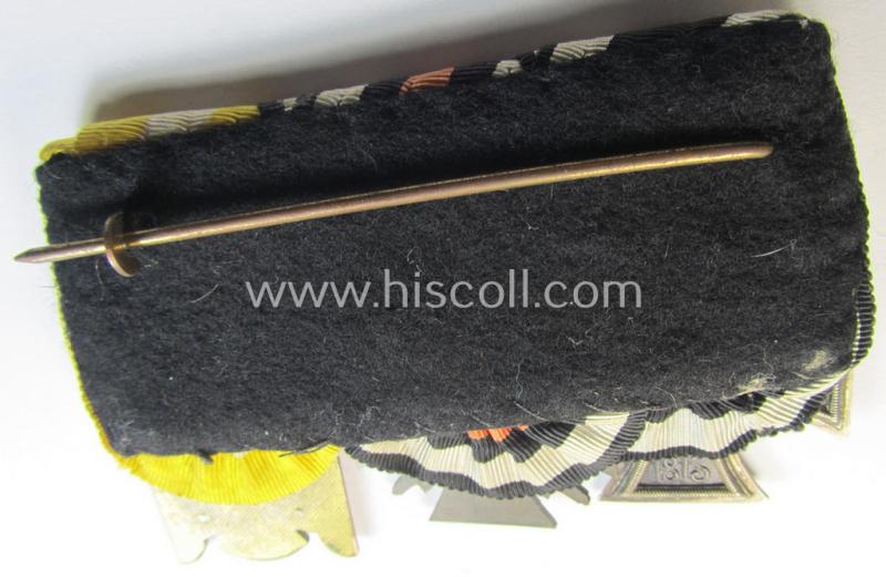 This is an attractive - and in this unusually found combination scarcely found! - example of a WWI-period, so-called: 'Ordenspange' (of the non-'detachable-pattern') and that is respectively showing an: 'Eisernes Kreuz II. Klasse' (or: iron cross second class), a WWI-period: 'Frontkämpferkreuz 1914-18 mit Schwertern' (ie.: 'Kriegsteilnehmerkreuz 1914-18 mit Schwertern') and a detailed (and scarcely found) so-called: 'Schlesisches Bewährungs-Abzeichen der 2. Stufe o. Schwertern'