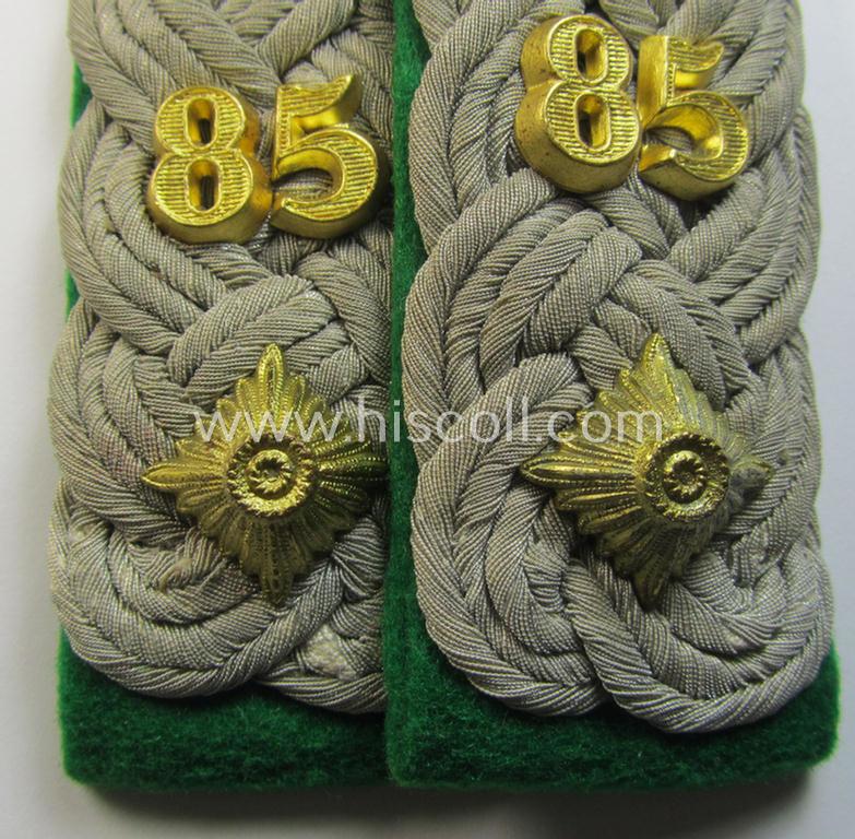 Attractive - and fully matching! - pair of WH (Heeres) neatly 'cyphered', officers'-type shoulderboards as piped in the darker-green-coloured branchcolour as was intended for usage by an: 'Oberstleutnant des Gebirgsjäger Regiments 85'