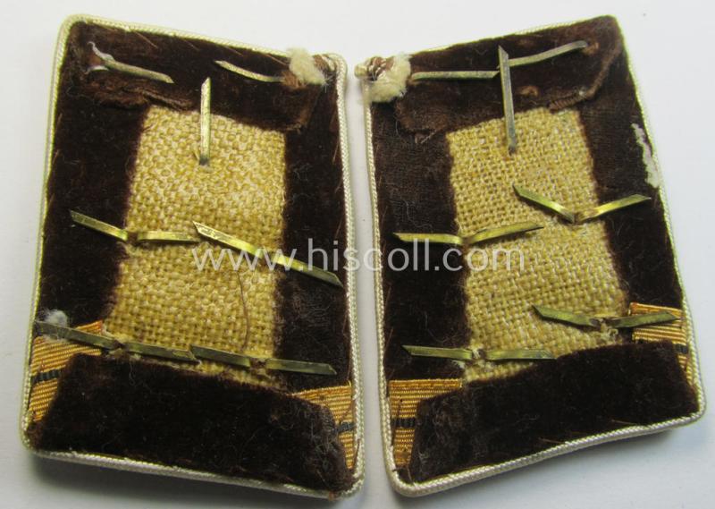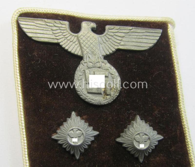 This is an attractive - fully matching and actually scarcely encountered! - pair of N.S.D.A.P.-type, velvet-based collar-patches (ie. 'Kragenspiegelsatz für politischen Leiter') being of the third- and final pattern as was used from 1941 onwards as was specifically intended for usage by an: 'N.S.D.A.P.-Hauptgemeinschaftsleiter' at 'Kreis'-level and that comes in an overall very nice- (ie. 'virtually mint- ie. unissued'-), condition. The neat pieces - which are constructed from the brown-coloured- and/or typical 'smooth-type'- (ie. velvet-type) cloth - come in a wonderful condition overall: they show a (matching!) pair of golden-coloured (albeit faded- ie. 'migriertes') eagle-devices, four (equally styled golden-toned) pips and a double-piece of golden-toned rank-braid period-attached and were simply never mounted on a tunic. The tabs are piped with white-coloured- and rayon-based piping (as always) signifying that the pair was intended for a party-official serving at: 'Kreis'-level. Both tabs came without an 'RzM'-etiket as issued and found. The set was most certainly never worn and originates from a fairly large cloth-insignia lot that originated from an older collection in the USA. The set shows some (truly non-disturbing) tarnish and/or aging caused by having been stored as such for decades (as can be noticed on the pictures). In any case is this a neat and fairly unusually encountered N.S.D.A.P.-collar-tab-set that is not that often offered for sale. Only the first such neat N.S.D.A.P.-related collar-tab-set in this particular rank I ever had on offer!