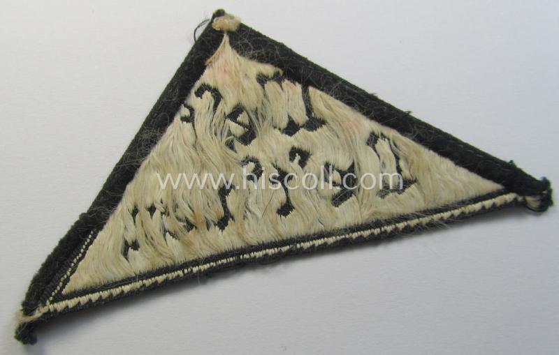 This is a 'female'-specimen, indicating that it is neatly woven in silver-white-coloured linnen on a black-coloured- (and also linnen-based-) background. This example was (I deem) clearly used- and/or worn and misses its (presumably once-attached) so-called: 'RzM-etiket'. The triangle shows some minimal age ie. staining, simply caused by decades of storage and moderate wear (as can be seen on the pictures). It should be mentioned that this is one of the more scarcely seen (Austrian) 'BDM-Gebietsdreiecke' within the extensive series. Simply an attractive - and moderately used and worn! - female-type 'BDM' ('Bund Deutscher Mädel') district-triangle that is with certainty accordingly priced!