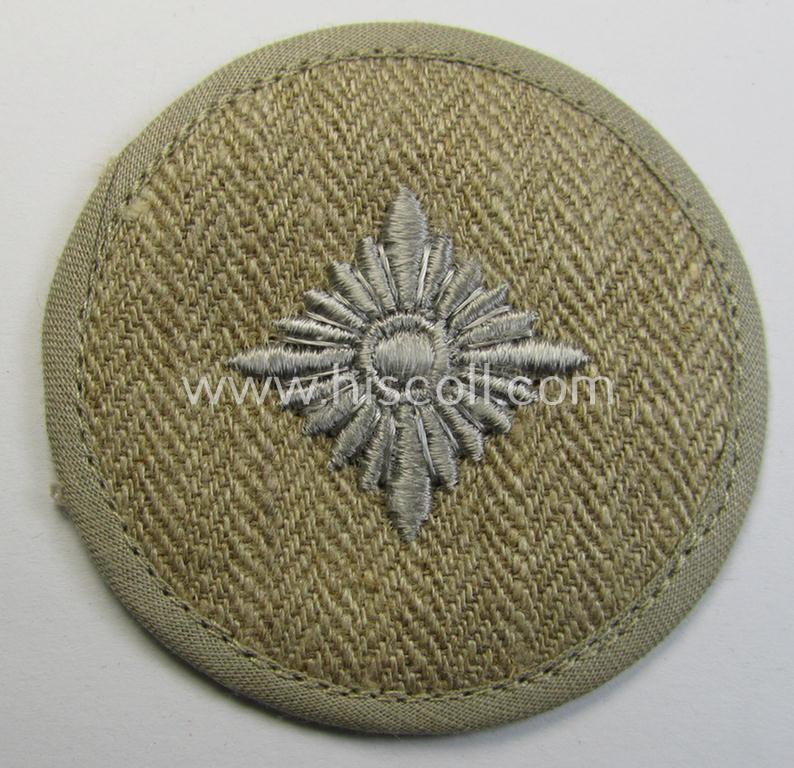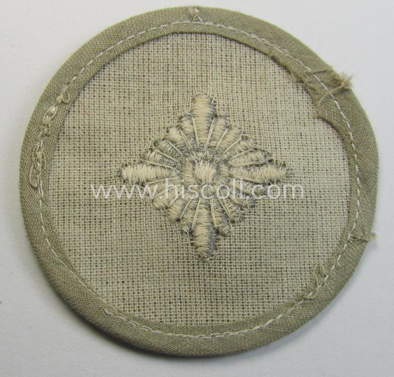 Attractive, WH (Heeres) rank-insignia (ie. arm-roundel) as was specifically intended for usage by an: 'Oberschütze' (being an interesting example as executed in silverish-grey-coloured linnen onto a 'HBT'-type, beige-coloured background)