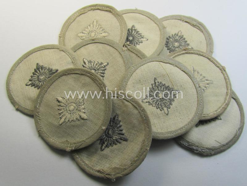 I recently found a small stack holding 12 examples of the WH (Heeres) rank-insignia (ie. arm-roundels) as was specifically intended for usage by an: 'Oberschütze' being an interesting examples as executed in silverish-grey-coloured linnen onto a so-called: 'HBT'-type- and/or beige-coloured background and that come all 12 in an overall very nice- (I deem never used- ie. 'virtually mint'-), condition. The pieces show some minimal age simply caused by having been been stored as such for decades. The pieces - which are not maker-marked but that show a beige-coloured 'fortified' border - are not backed as can be seen from the pictures. It sounds maybe strange but these 'simple' Heeres- rank-badges are actually quite hard to encounter. My asking-price is naturally intended per one single specimen. Simply a great occasion to acquire a neat Heeres-rank-badge as intended for a Heeres soldier having the rank of: 'Oberschütze'!