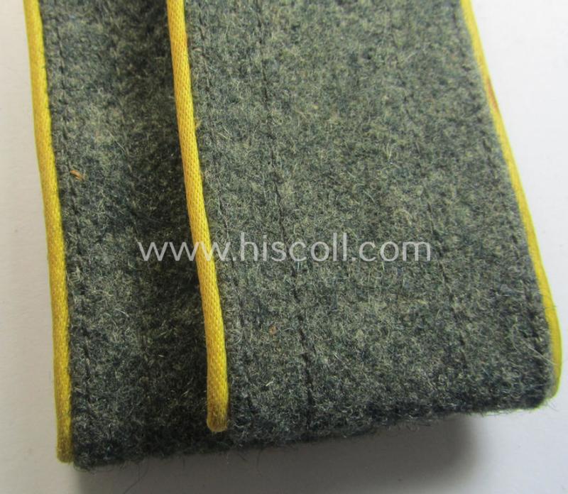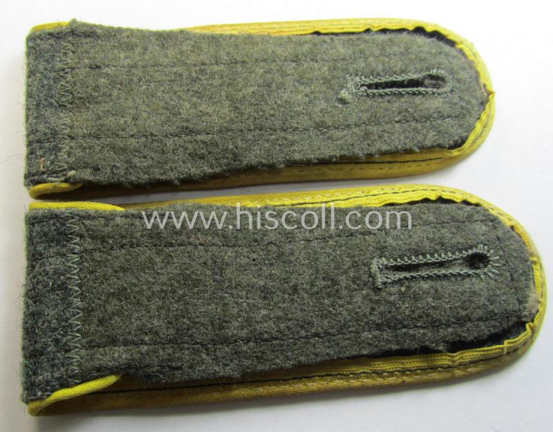 This is an attractive - just moderately used and/or fully matching! - pair of later-war-period, WH (Heeres) so-called: 'M44'-styled, 'simplified', enlisted-mens'-type shoulderstraps as was piped in the neat bright-yellow- (ie. 'zitronengelber'-) coloured branchcolour as was intended for - and used by! - a: 'Soldat der Nachrichten-Truppen' (or: simple soldier who served within a later-war-period, army signals'-regiment) and that comes in an overall very nice- (ie. truly used- and/or worn-), condition. The straps - which are approximately 11 cms. sized in length each as more often - have the 'standard-pattern'- and/or typical, field-grey-coloured and/or woolen-based 'upperdecks' (which are executed in so-called: Italian wool aka 'drap Orti') and/or typical tongues and do show the bright-yellow- (ie. 'zitronengelber'-) coloured and/or: 'silk-like'-type branchcolour (ie. piping) attached. The straps are constructed following the typical '1944 cloth-minimising production-manner' using different shades of wool and/or material (as can be seen on the pictures). The straps - that originate from my private shoulder-strap-collection - show some minimal age, wear and/or staining simply caused by moderate wear and/or decades of storage. It should be noted that all 'M44'-style, EM-pattern shoulderstraps are actually quite hard to encounter and can easily be graded 'scarce': even more so when they come in a truly used- and/or worn condition. Simply a nice occasion to acquire an attractive - and fully 'text-book'! - M44-styled, enlisted-mens'-type shoulderstrap-pair as was intended for usage by a: 'Soldat der Nachrichten-Truppen': great to complete any later-war M44- (ie. even M43-) model 'Heeres'-tunic!