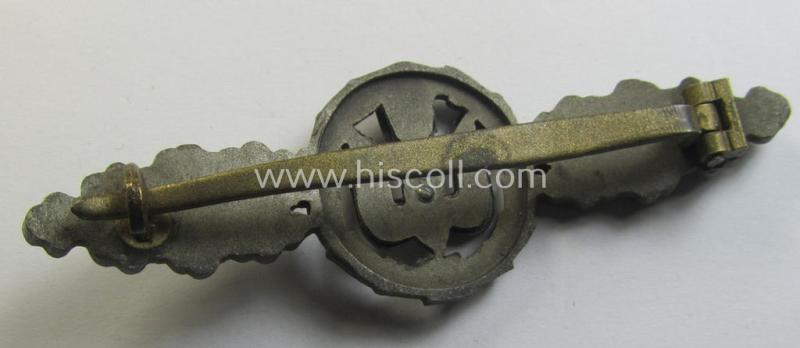 This is an attractive - very pronounced and truly converse-shaped- ie. vaulted! - example of a typical zinc- (ie. 'Feinzink' and/or partly 'Buntmetall'-) based, non-maker-marked WH (Luftwaffe) 'Frontflugspange für Kampfflieger in Bronze' (or: bronze-class bomber-pilots'-clasp ie. FFS) as was produced by a (by me) unidentified maker and that comes in an overall very nice- (ie. I deem just moderately used- and/or worn-), condition. The neat piece has simply extraordinary detail and retains most of its period-applied- (and somewhat bright), golden-bronze-toned finish: the silver-blue-coloured- (and 'Buntmetall'-based!) eagle-device (which is additionally attached to the clasp) is equally detailed and also retains most of its silver-toned and/or minimal 'tarnished' finish. The piece shows, however, great character and/or fine, pronounced detail. The clasp comes naturally in great shape ie. order: the (golden-coloured) pin-/ie. pin-attachment, period-catch and/or single rivet are in fine (and/or undamaged nor repaired-) order. The clasp has never been cleaned nor polished and has a neat and/or slightly tarnished 'age-patina'. It originated from a private-household in Germany and was never before part of any collection. Simply a neat - and not that often encountered! - Luftwaffe-award ie. FFS that is with certainty accordingly priced!