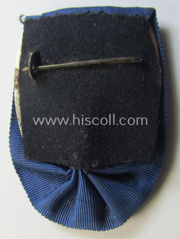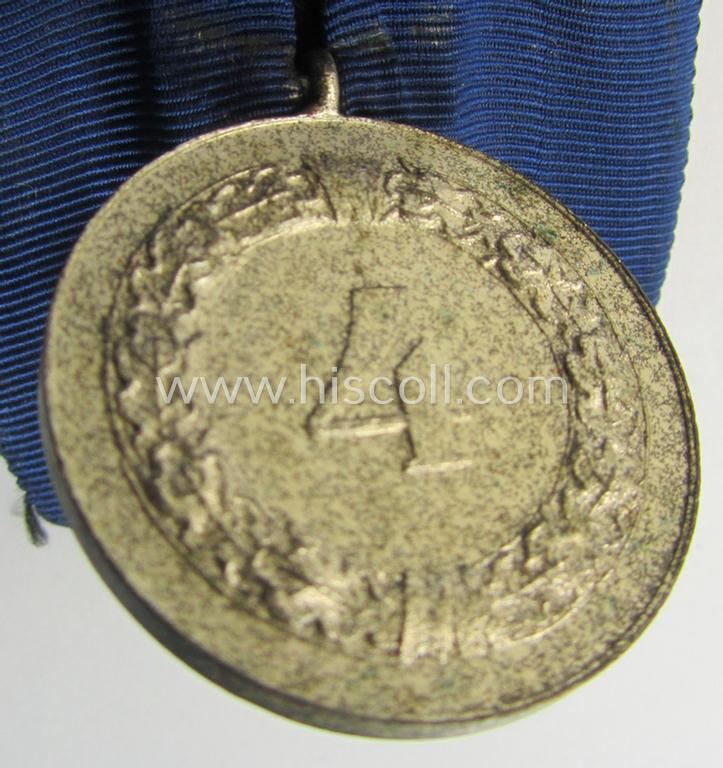 This is an attractive - and I deem just moderately used- and/or worn! - example of a minimally tarnished, silver-toned WH (Heeres o. Kriegsmarine) so-called: 'Einzelspange' (or: single-pieced medal-bar) showing a detailed: 'WH-Dienstauszeichnung 4. Stufe' (as was intended for 4 years of loyal-service) and that has a neat and pronounced (regular-sized) WH (Heeres o. Kriegsmarine) eagle-device period-attached and that comes mounted onto its confectioned, darker-blue- (ie. cornflower-blue-) coloured ribbon as issued and/or worn. The detail on this example is simply extraordinary: it has - I deem - never been cleaned nor polished and has an attractive and as stated above minimally tarnished) age-patina. The medal comes 'mounted' onto a chromed-metal-based clasp (with functional pin/catch-set-up) as was intended for wearing this example on a 'going-out'- ie. dress-tunic or 'Waffenrock'. This example truly retains gorgeous details and has a great age-patina: it retains most of its somewhat 'matted'- and/or: silver-toned finish without showing any defaults. The piece is neatly 'backed' with a piece of darker-blue-coloured wool as is more often seen (as can be seen on the pictures). The blue-coloured ribbon shows only minimal usage and/or staining. Simply an attractive WH (Heeres o. Kriegsmarine) example that comes mounted as an: 'Einzelspange'!