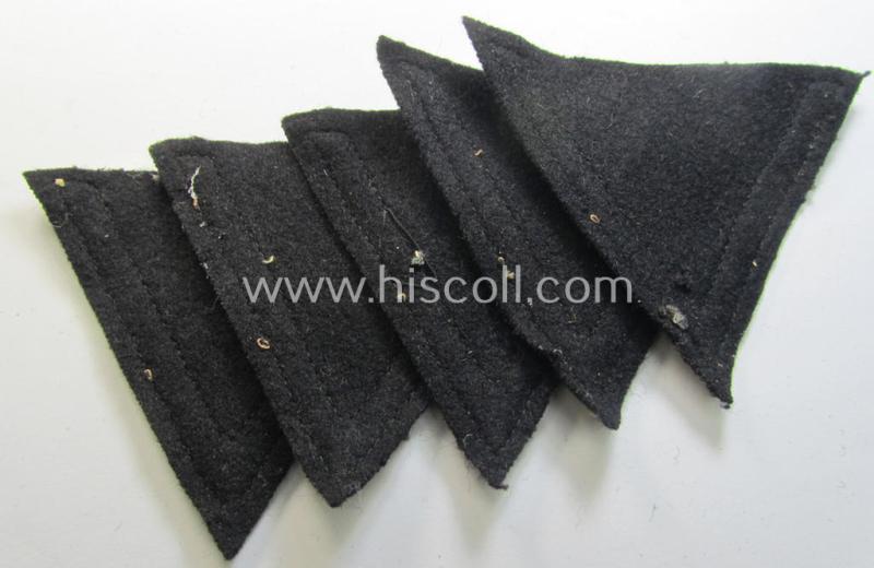 I recently uncovered 15 - fully identical and I deem simply never used- nor worn! - examples of a Waffen-SS-type 'Armwinkel' (or: rank-chevron) as executed on black-coloured wool as was specifically intended for usage by an SS-soldier with the rank of: 'SS-Sturmmann' and that come all fifteen in an overall very nice- (ie. simply never used- nor worn- ie. 'virtually mint- ie. unissued', condition. The chevrons are executed on the 'smooth-type'- and/or black-coloured wool and show a single stripe of the yellowish-brown-coloured (ie. tropical-styled) NCO-braid attached, denoting the rank of: 'SS-Sturmmann'. The pieces shows some minimal aging, dust ie. staining simply caused by decades of storage only. It should be noted that some people also deem that these particular rank-chevrons could also be used as WH (Heeres) Panzer-insignia: I personally think that they were merely produced for Waffen-SS-usage and were for example used on the camouflaged, 'M44-type', 'Dot'-pattern tunics. My asking-price is naturally intended per single specimen. It sounds maybe strange but these 'simple', 'Waffen-SS'-rank-insignia are not that easy to encounter!