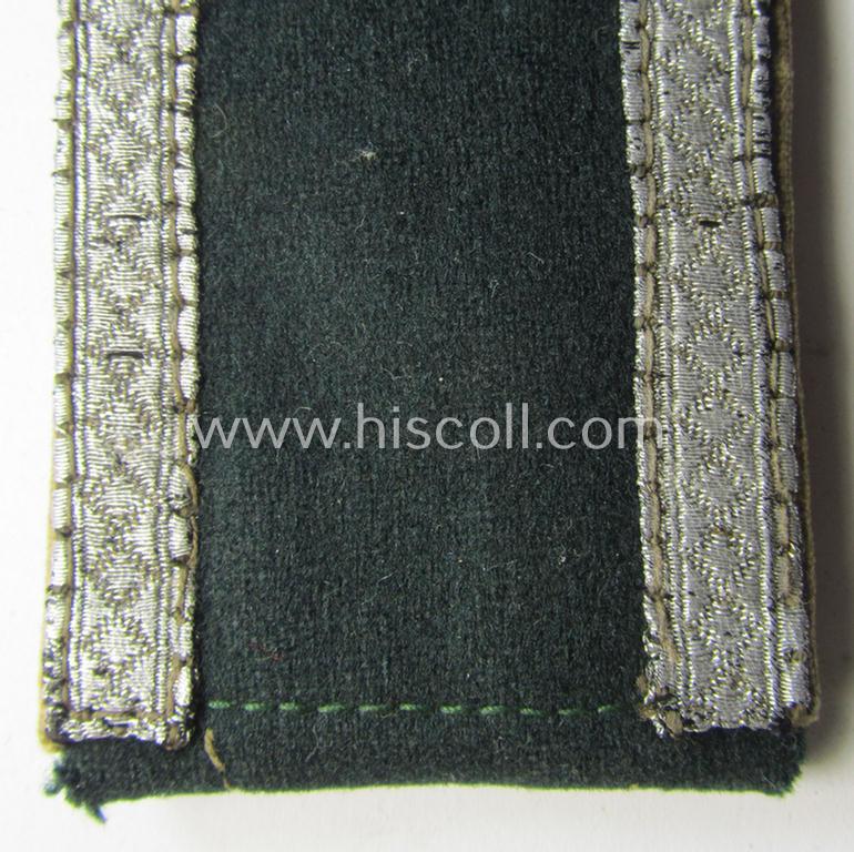 This is an attractive - clearly worn albeit regrettably single! - (I deem) pre- (ie. early) war-period, so-called: 'M36 o. M40'-pattern, WH (Heeres) NCO-type shoulderstrap as piped in the white- (ie. 'weisser'-) coloured branchcolour as was intended for usage by an: 'Unteroffizier der Infanterie-Truppen' (or: junior-sergeant who served within the army infantry-troops) and that comes in an overall nice- (ie. clearly used- and/or worn-), condition. The shoulderstrap - which measures approximately 10,2 cms. in length as more often seen - has the darker-green-toned 'upperdeck' and has the woolen-type piping attached (as is more encountered with these early-war-period shoulderstraps). The shoulderstrap - which originates from a larger cloth- and insignia-collection I recently acquired for the web-site - comes mounted onto its functional tongue and shows the bright-silver-toned (ie. non-sub-dued) NCO-braid period-attached. Simply a neat - and/or fully 'text-book'! - 'M36 o. M40'-pattern, NCO-type 'Infanterie'-shoulderstrap that was intended for usage by an: 'Unteroffizier der Infanterie-Truppen'!