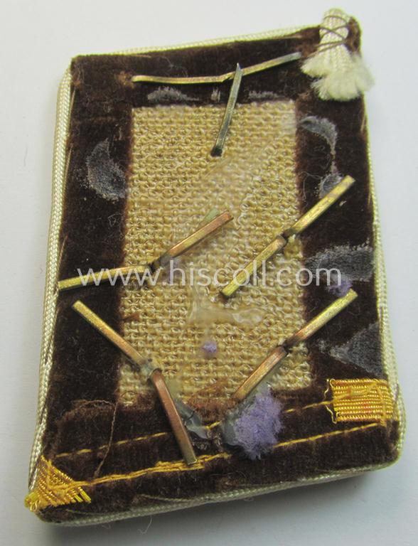 This is an attractive - albeit regrettably single! - N.S.D.A.P.-type collar-patch (ie. 'Kragenspiegel für politischen Leiter') being of the second pattern as was used from 1934 upto 1939 being a piece as was specifically intended for usage by an: 'N.S.D.A.P.-Obergemeinschaftsleiter' at 'Kreis'-level and that comes in an overall nice- (albeit just moderately used- ie. worn-), condition. The piece - which is constructed from the darker-brown-coloured- and/or 'smooth-type'- (ie. typical 'velvet-type') cloth - comes in a just minimally used- and/or worn condition overall: it shows a bright-golden-toned eagle-device, four specifically-styled pips and a single (braid-based) 'bar' period-attached and was clearly once mounted onto a tunic or shirt. The tab is piped with typical white- (ie. 'weisser'-) coloured- and/or rayon-based piping (as always) signifying that it was intended for a party-official serving at: 'Kreis'-level. The tab is neatly backed with a piece of 'buckram'-based material and is void of an 'RzM'-etiket (as can be seen on the pictures): the tab does show obvious wear, age and/or staining. Simply an attractive - and actually quite usually encountered! - 'Politischen Leiter der N.S.D.A.P.'-collar-tab that is not that often offered for sale and that is I deem accordingly priced!