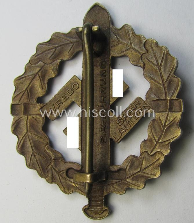 Neat - and just minimally used! - early- (ie. mid-) war period example of an: 'SA-Sportabzeichen in Bronze' being a nicely maker- (ie. 'W. Redo - Saarlautern'-) marked example that is void of an an impressed bearers'-number