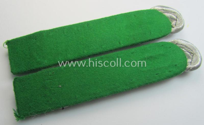 This is an attractive - fully matching, never before seen and most certainly scarcely encountered! - pair of (high-ranked!) officers'-type shoulderboards as was intended for usage by a: 'Warnzentralenoberführer des L.S. Warndienstes' (or: 'LSW') being the highest possible rank in this small-sized TR-organisation and that comes in an overall very nice- (I deem simply never used- nor tunic-attached- ie. 'virtually mint- ie. unissued'-), condition. The straps - that measure 12,5 cms. in length each - have the (typical 'L.S. Warndienst'-related!) silverish-green-toned- (ie. braid-based) 'upperdecks' and darker-green- (ie. 'grüner'-) coloured (and smooth-woolen-type) 'underlays' attached. The boards never had any tongues attached and were most certainly intended to be used as pair of the 'sew-in'-pattern. It should be noted that the 'Luftschutz-Warndienst' (or: 'LSW') was a smaller-sized TR-period organisation that fell under the jurisdiction of the RLB (or: 'Reichs-Luftschutz Bund'). Of additional interest is, moreover, the fact that the 'LSW' had ie. held ONLY four officers'-ranks of which the rank of: 'Warnzentralenoberführer was the highest. I deem that I have priced this attractive - and without doubt very scarcely encountered! - 'LSW'-related shoulderboard-pair accordingly: I have never seen another pair for sale!