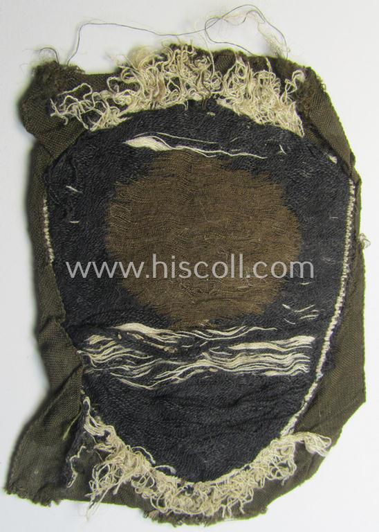 This is an attractive - and actually scarcely encountered! - female-related, enlisted- (ie. NCO-) pattern, so-called: 'RADwJ'-sleeve-badge (ie. 'Abzeichen des Reichsarbeitsdienst der weiblichen Jugend') being an example as executed in neat so-called: 'BeVo'-weave-pattern and that comes in an overall nice- (albeit surely used- and/or carefully tunic-removed- ie. once worn-), condition. The badge is neatly white- (ie. black-) coloured having a typical, darker-toned brownish-coloured background and was intended for a female RADwJ-staff-member: it was clearly worn and shows some minimal staining and was (once) carefully trimmed ie. confectioned (as can be seen on the pictures). Of additional interest is, moreover, the fact that this example shows the (Roman-styled) numerals: 'III' (signifying that it was an example that was worn by a member of the 3rd region ie. department ie. 'Bezirk'). The badge is not maker-marked (as is more commonly encountered: most of the copied examples show a full and interwoven logo whereas this example is of course a garuanteed orginal and used example). It should be noted that excellent copies of these badges do exist: this is naturally a genuine-, period example that originated from a German private-household. Simply a neat - and truly scarcely encountered! - enlisted- (ie. NCO-) pattern RADwJ-related arm-badge!