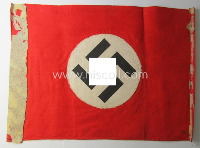 The neat - somewhat smaller-sized and nicely constructed! - (I deem) vehicle- ie. bicycle-flag (ie. 'Fahrrad-Fahne') measures approximately 26,5 x 19 cms. and is nicely constructed from bright-red- (and printed white) coloured linnen and that shows (on both sides!) a nicely printed 'swastika-patch' and that comes in an overall nicely preserved condition. The decorative 'Fahne' is (I deem) just moderately used and does show some minimal age and/or staining caused by slight usage and/or decades of storage (it is however totally void of any real damage or alike and retains bright and vivid colours as can be seen on the pictures). The neat piece is 'double-sided' but is void of its (presumably once-present 'attachment-rope' in place (which were intended to attach it to a bicycle or vehicle or alike). The piece was (I deem) once glued into an album or scrap-book and does show some minimal glued-on carton-remains on its sides( as can be noticed on the pictures). I am, however, convinced that this is a not that often encountered party-related item that is accordingly priced!