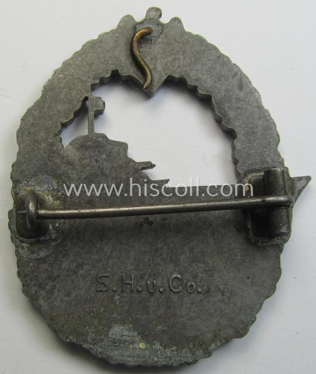 Attractive - albeit moderately used- ie. worn! - WH (Kriegsmarine) 'Zerstörerkriegsabzeichen' being a clearly maker-marked example as executed in 'Feinzink' as was produced by the desirable maker (ie. 'Hersteller'): 'S.H.u.Co.'