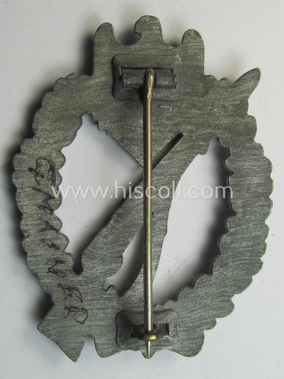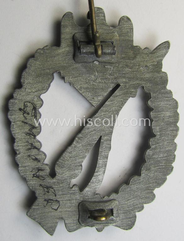 Attractive, silver-class 'Infanterie Sturmabzeichen in Silber' being a (typically) unmarked so-called: 'pillow-crimped'-pattern example as was executed in silverish-coloured, zinc-based metal (ie. 'Feinzink')